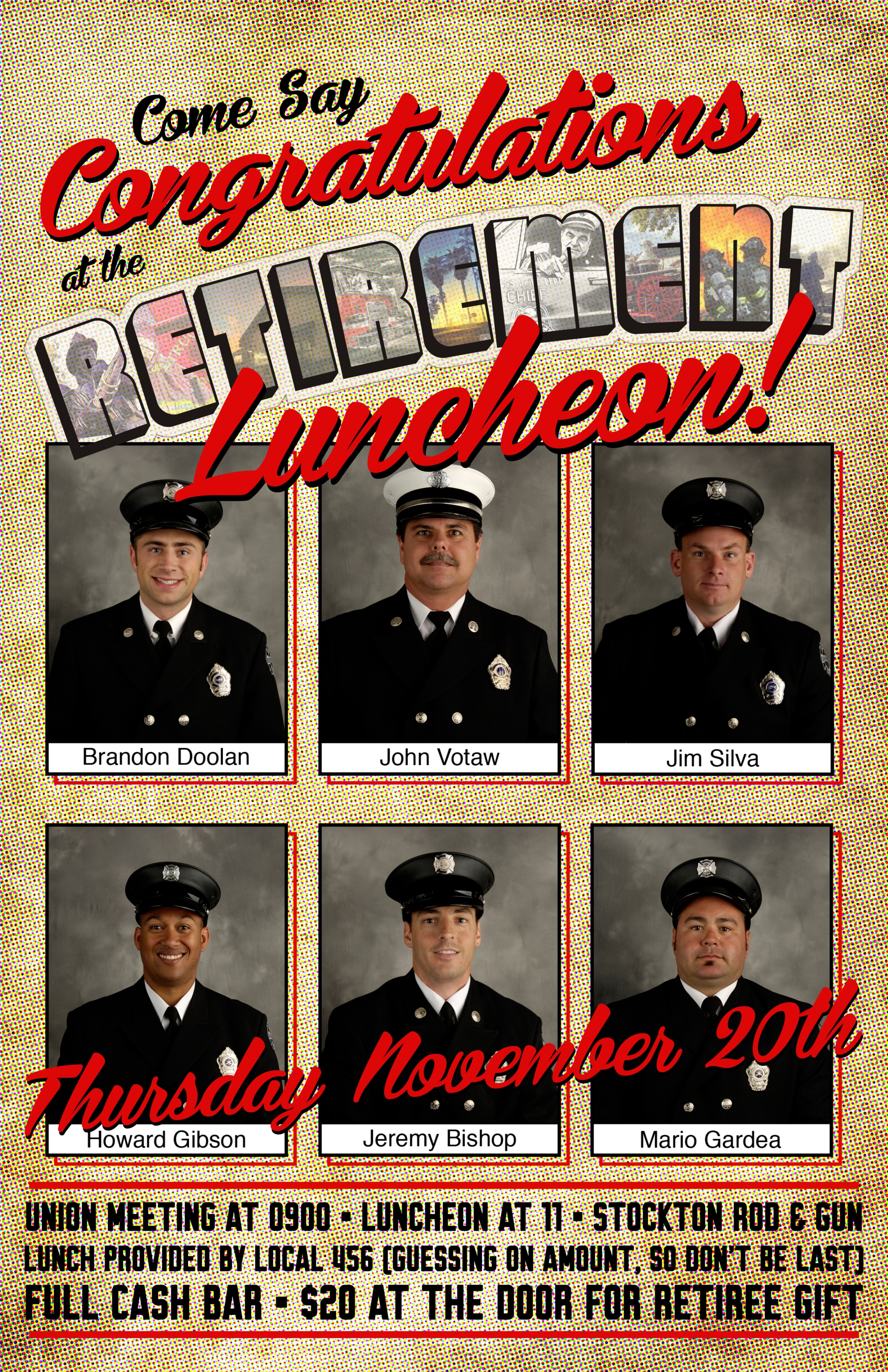 A retirement luncheon will be held @ the Rod & Gun immediately after the general meeting on November 20. Meeting starts at 9 AM, luncheon starts at 11 AM.