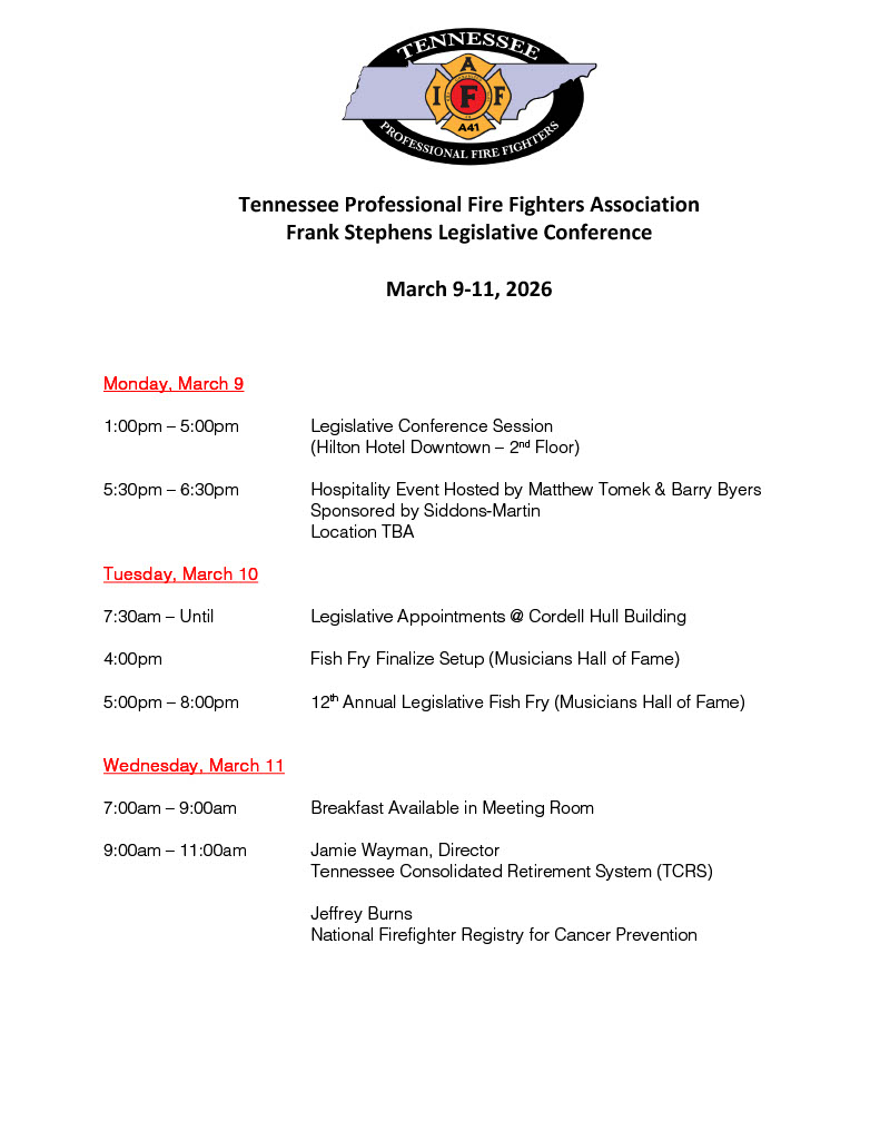 The Tennessee Professional Fire Fighters Association will host the 2026 Frank Stephens Legislative Conference on March 9th –11th, 2026, in Nashville, at the Hilton Hotel Downtown, located at 121 4th Ave. S, Nashville, TN 37201.